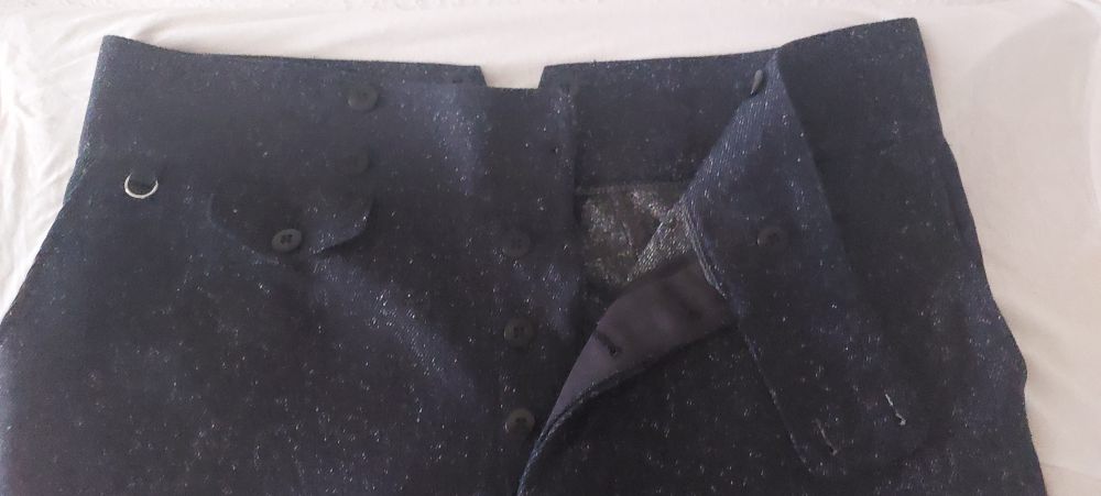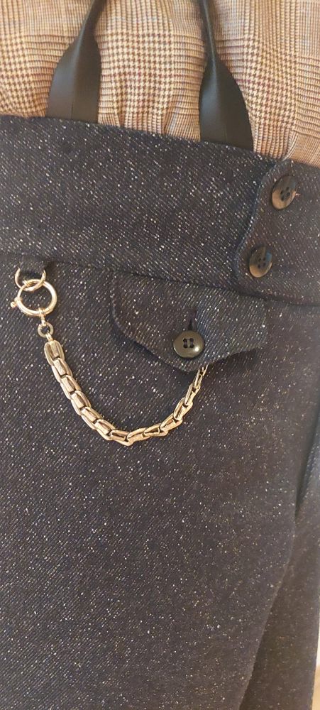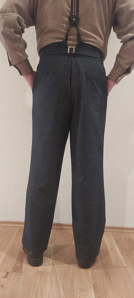 Gefertigt aus Dunkelblau meliertem Baumwolltwill., 7 cm breiter verstärkter Bund, 1 aufgesetzte Gesäßtasche, Uhrentasche mit Patte und natürlich einer Schlaufe mit Ring zum einhängen der Uhrenkette.Selbstverständlich eingenähte Knöpfe für Hosenträger ,außerdem ist am Bund 1 Riegel mit Schnalle und Keil zum regulieren der Bundweite angebracht, der Bund kann so um gute 3 cm enger gemacht werden. Die Hose lässt sich mit als auch ohne Hosenträger tragen, ganz nach belieben. Nicht zu vergessen ist natürlich die Knopfleiste am Eingriff, eben so wie es sein muß.Wie alle Hosenmodelle wird auch diese in Überlänge geliefert so das auch die großen Herren bis 2,00 Mtr. lässig damit auskommen. Getragen wird die Hose ohne Aufschlag wie seinerzeit üblich, wer aber möchte kann natürlich individuell verfahren, hier empfehlen wir einen Aufschlag von 6 cm.