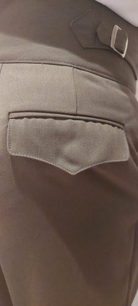 Eine Hose wie man sie sicherlich nicht an jeder Ecke zu sehen bekommt, mit hohem Aufwand bis ins letzte Detail von uns nach einem deutschen Schnittmuster exklusiv umgesetzt. Die Hose verfügt über eine Bundfalte, 2 Gesäßtaschen mit geschwungener Patte, 2 Paspeltaschen, 2 Bundschnallen zur Regulierung der Bundweite, die Hosenbeine sind vorn bis unter das Knie abgefüttert. Der einzige Kompromiss der hier eingegangen wurde ist der Metallreißverschluss anstatt der Knopfleiste, ein jeder Herr wird die kleine Änderung wohl begrüßen. Die Hose wird mit offenem Saum in Überlänge geliefert zur individuellen Änderung, so das auch die großen Herren bis 2,00 Mtr. lässig damit auskommen, Saumband wird selbstverständlich mitgeliefert. Getragen kann die Hose werden mit 6 cm Aufschlag oder ohne, ganz wie es beliebt.